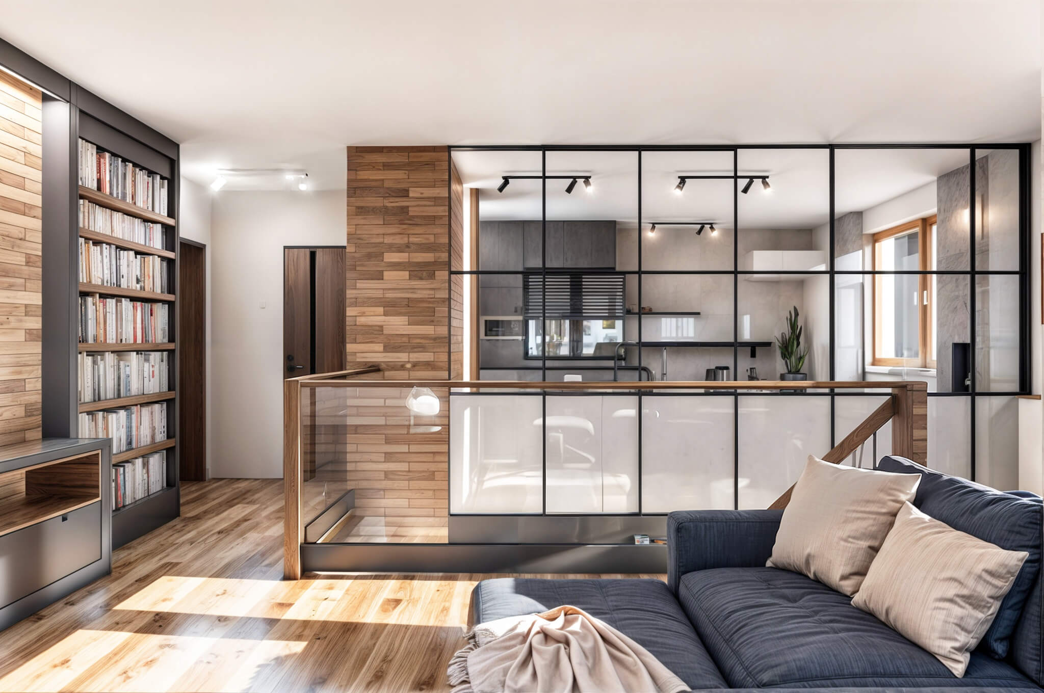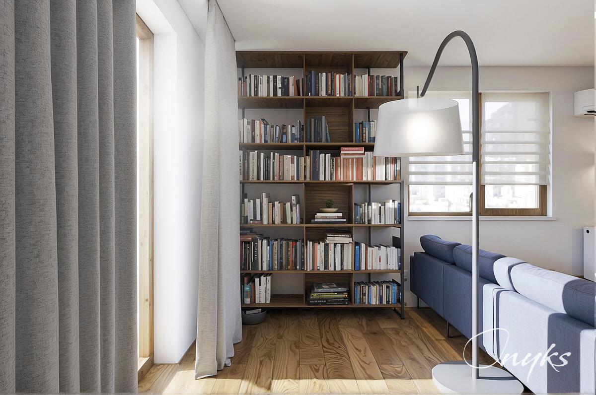 Kiedy myślę o domu, widzę miejsce pełne ciepła, w którym kominek tli się spokojnym ogniem, a dzieci z radością biegają po salonie. Nasza aranżacja zawiera typowo, loftowe akcenty  – Całość dopełniają akcenty w odcieniu Seaport Blue od Benjamin Moore, czerń metalu i cegła – typowe dla loftu, ale podane w lekkiej, przytulnej formie..