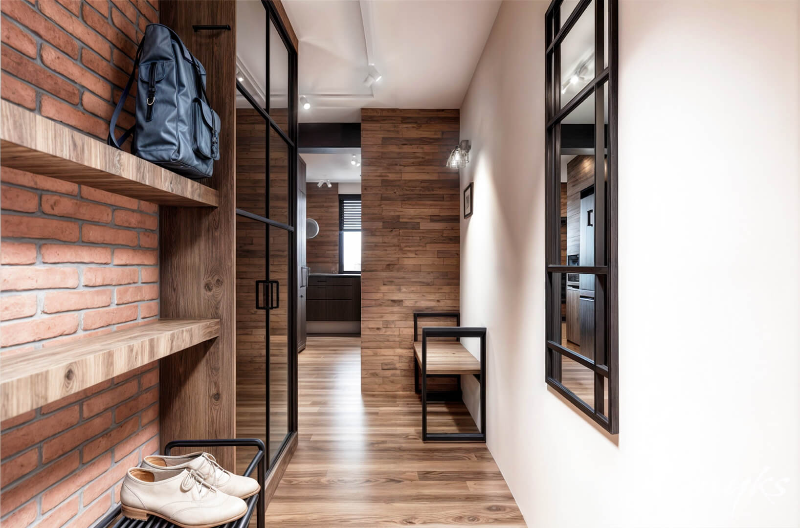 To wnętrze udowadnia, że industrialne inspiracje mogą iść w parze z ciepłem i domowym komfortem. Już od wejścia goście wiedzą, że będzie loftowo, ale bez surowości – zamiast typowych szynoprzewodów zastosowano długie oprawy od Nowodvorski Lighting, które świetnie sprawdzają się w ciągach komunikacyjnych.